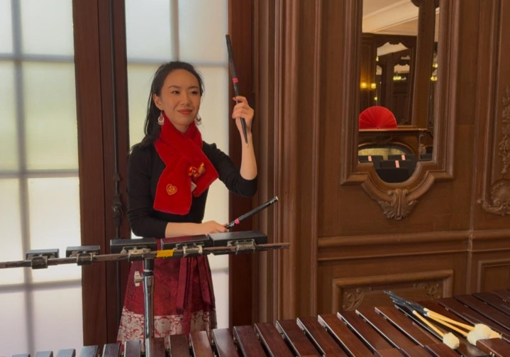 镜厅不大,乐队与第一排观众座椅距离也就在1米左右。来自四川宜宾的打击乐博士张佳婧,正在敲击马林巴,演奏《草原英雄小姐妹》。这是她第一次参加上音的新春音乐会。为了这场零距离的演出,她放弃除夕回家团圆,把归期改到了初二。那些沉浸、陶醉的眼神,让她的情绪也始终饱满,“这种过年的氛围特别好”。